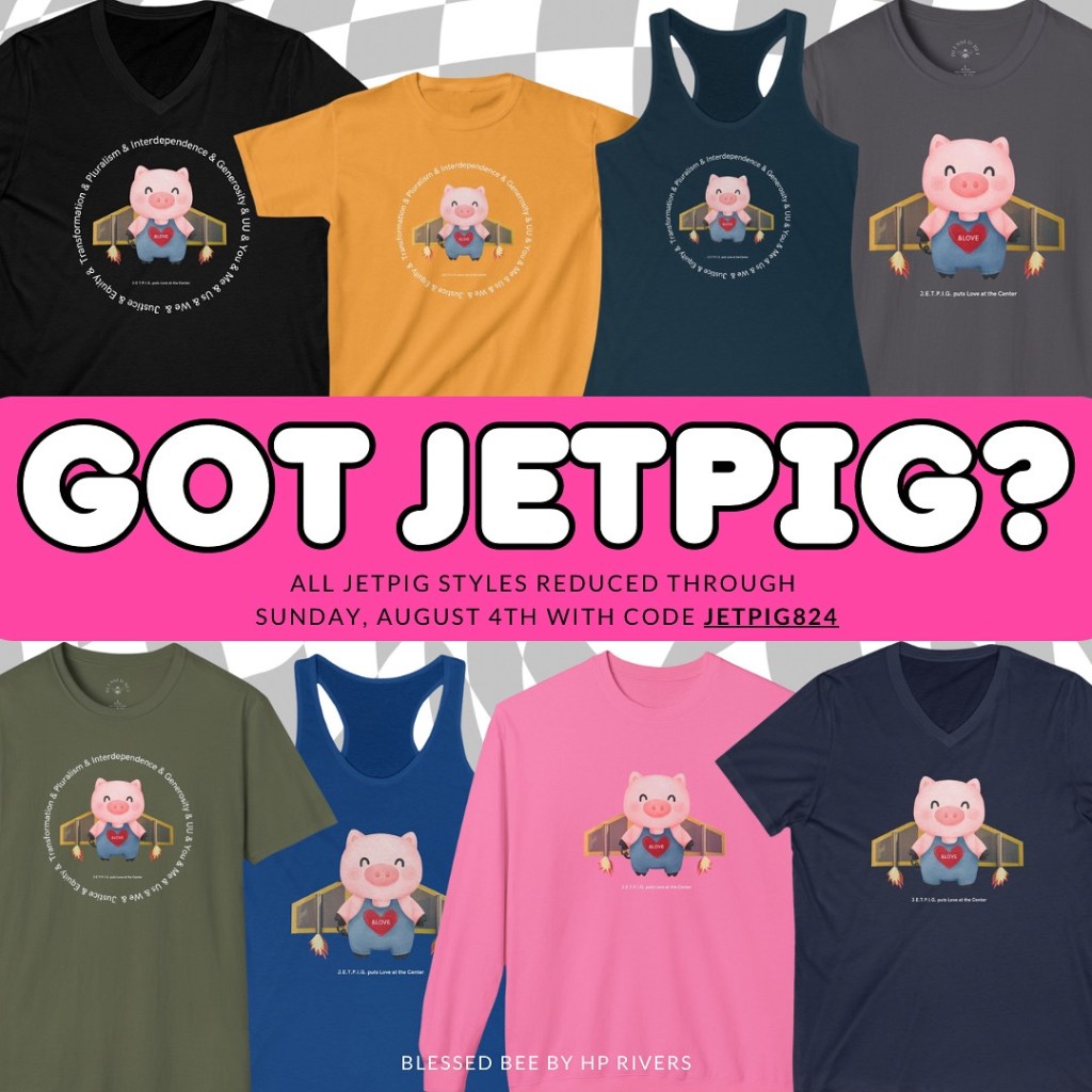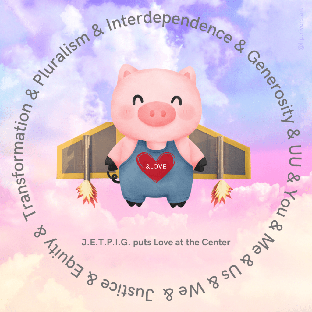 In case you missed it, JETPIG is an acronym that stands for Justice, Equity, Transformation, Pluralism, Interdependence, Generosity – shared values in Unitarian Universalism.